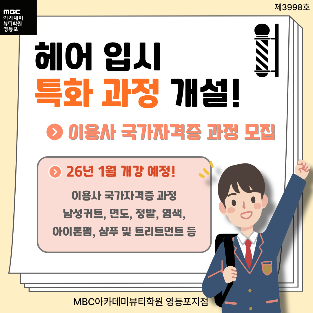MBC아카데미뷰티학원 영등포지점 관계자는 “이용사 자격증은 남성 헤어 전문 기술자로 성장하기 위한 핵심 단계이자, 입시 경쟁력을 높이는 중요한 자격”이라며 “수강생들이 실제 시험장에서 자신 있게 시술할 수 있도록 체계적인 교육을 진행할 예정”이라고 밝혔다.