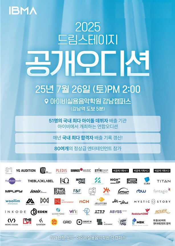 ‘2025 드림스테이지 썸머 연합오디션’ 주관을 맡고 있는 아이비실용음악학원은 국내 최다 아이돌 데뷔 배출 실적을 보유한 교육기관으로서 서수진, 에이티즈 여상, 트레저 박정우, 소정환, 로시, 유연정, 모모랜드 주이 등 51명의 아이돌을 배출한 것으로 유명하다.