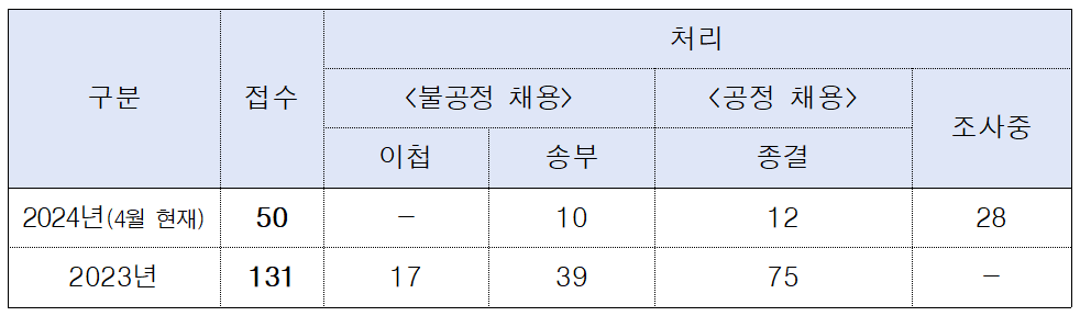 채용비리통합신고센터 출범 후 181건의 신고사건을 접수했고, 이 중 66건을 수사기관 및 감독기관에 이첩·송부하여 사후 조치를 취했다.
