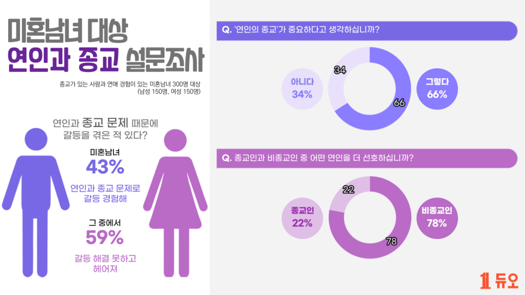 결혼정보업체 듀오 조사 결과 응답자의 43%는 연인과 종교 문제로 갈등을 겪은 것으로 나타났으며, 과반(59%)은 ‘해결하지 못하고 헤어졌다’고 답했다.
