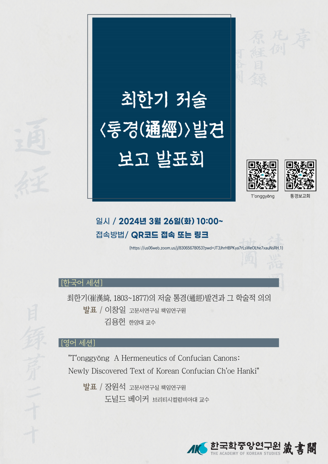 세미나는 한국어 세션과 영어 세션이 연속으로 진행되며 최한기 연구의 권위자인 한양대 김용헌 교수와 한국사상 전문가 캐나다 브리티시컬럼비아대학의 도널드 베이커 교수가 토론자로 나서 ‘통경’ 발견의 의미를 논할 예정이다.
