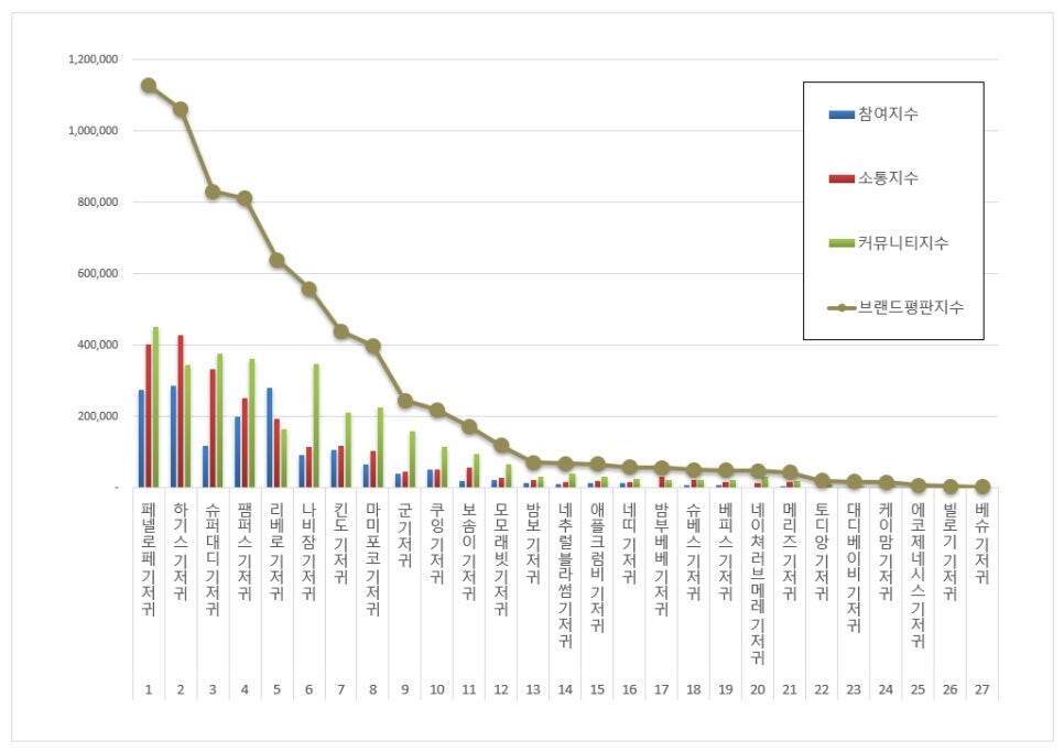 브랜드에 대한 평판은 브랜드에 대한 소비자들의 활동 빅데이터를 참여가치, 소통가치, 소셜가치, 시장가치, 재무가치로 나누게 된다. 기저귀 브랜드 브랜드평판지수는 참여지수, 소통지수, 커뮤니티지수로 분석했다.