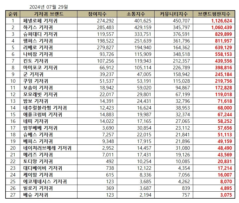 2024년 7월 기저귀 브랜드평판 빅데이터 분석 순위는 페넬로페, 하기스, 슈퍼대디, 팸퍼스, 리베로, 나비잠, 킨도, 마미포코, 군, 쿠잉, 보솜이, 모모래빗, 밤보, 네추럴블라썸, 애플크럼비, 네띠, 밤부베베, 슈베스, 베피스, 네이쳐러브메레, 메리즈, 토디앙, 대디베이비, 케이맘, 에코제네시스, 빌로기, 베슈 기저귀 순으로 분석됐다.