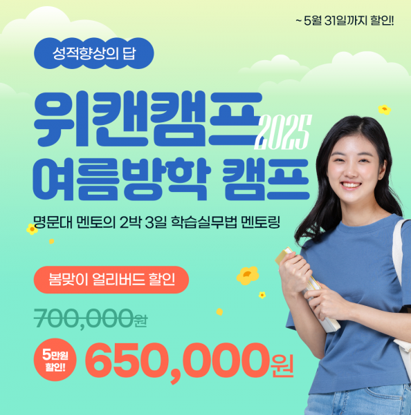 한국진로개발원이 단독 주관하는 서울대 공신 학습실무법 멘토링 캠프 위캔캠프가 2025 여름방학캠프 참가자를 모집하고 있다. 오는 31일까지 참가비 5만원을 할인하는 얼리버드 이벤트를 진행 중이며, 동반입소와 재입소의 경우에도 각각 할인 혜택을 제공하고 있다.