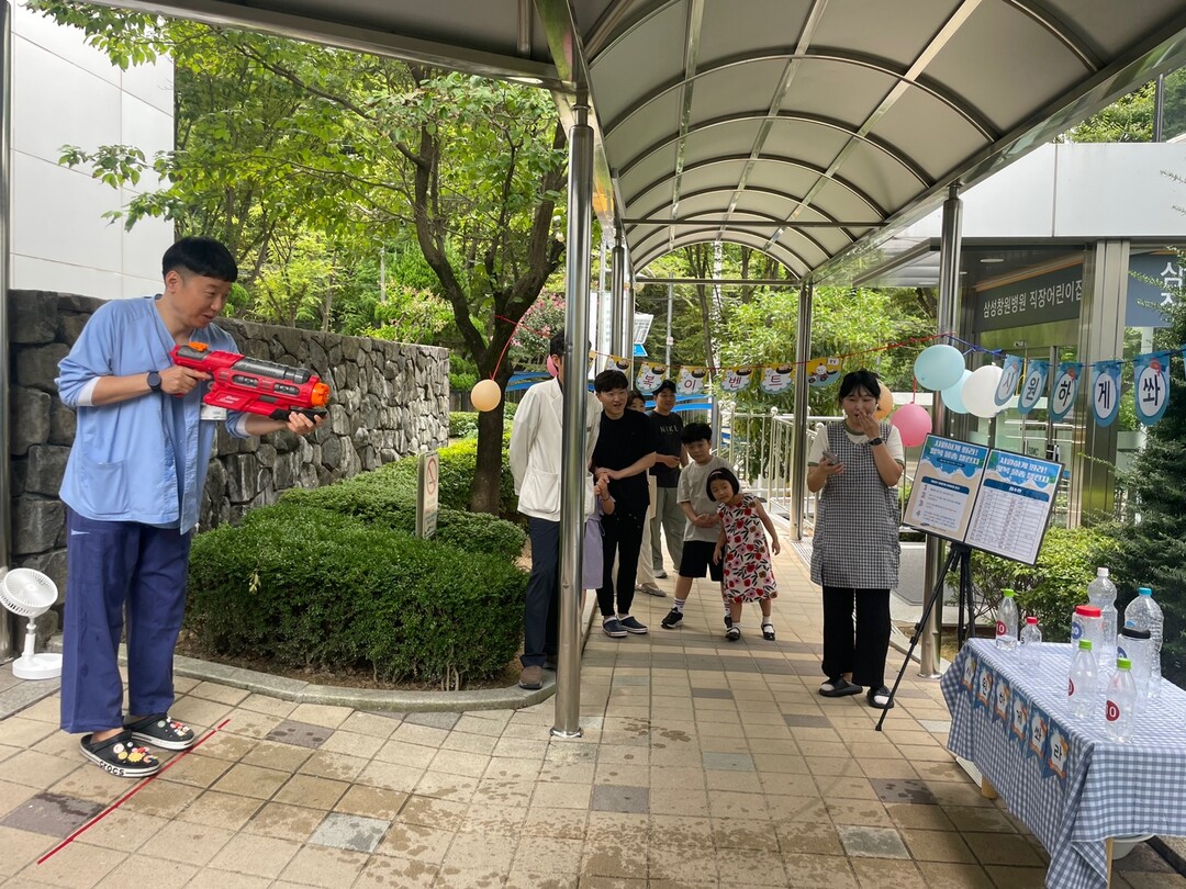 행사는 어린이집 점심시간인 오후 12시 30분부터 1시간 동안 진행돼 병원 내 근무하는 부모들이 삼삼오오 모여 참여했다. 휴가 중임에도 아이와의 특별한 시간을 위해 찾아온 학부모들도 물총을 들고 경쟁에 나섰다. 참가자들은 제한 시간 안에 물총으로 물병을 쓰러뜨리며 열띤 승부를 펼쳤고, 순위에 따라 1등부터 5등까지 푸짐한 상품이 전달됐다. 특히 1등 상품 ‘복날 꾸러미’에는 자녀와 함께 즐길 수 있는 놀잇감 등이 담겨 뜨거운 호응을 얻었다.