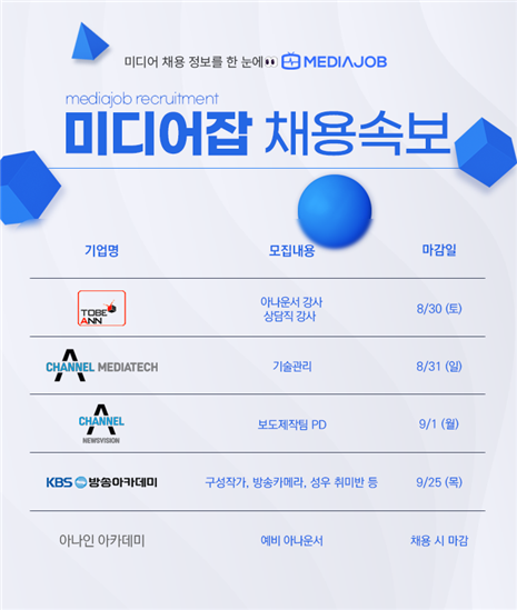 [피앤피뉴스=마성배 기자] 미디어잡이 방송·언론 분야 주요 기업과 아카데미의 채용 소식을 공개했다. 이번 채용은 방송기술부터 보도제작, 아나운서 교육과정까지 다양한 직종을 포괄해 예비 방송인들의 관심이 쏠리고 있다.