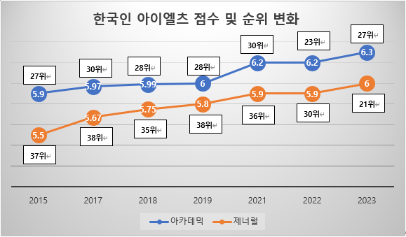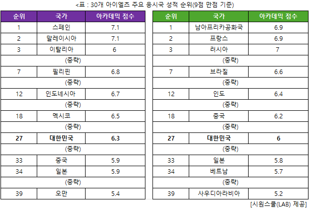 한국은 아카데믹 모듈에서 평균 6.3점을 기록해 27위, 제너럴 모듈에서는 평균 6.0점으로 21위를 차지했다. 특히, 한국의 제너럴 모듈 성적은 지난 수년간 하위권에 머물렀던 것과 달리 큰 폭으로 상승하며 중위권에 진입했다는 점에서 의미가 깊다.
