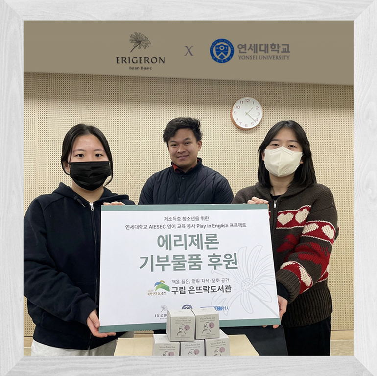 [피앤피뉴스=이수 기자] 친환경 프리미엄 비건 뷰티 브랜드 에리제론에서 연세대학교 AIESEC 국제리더십학생협회의 영어교육봉사 ‘Play in English 프로젝트’에 기부물품을 후원했다고 밝혔다.