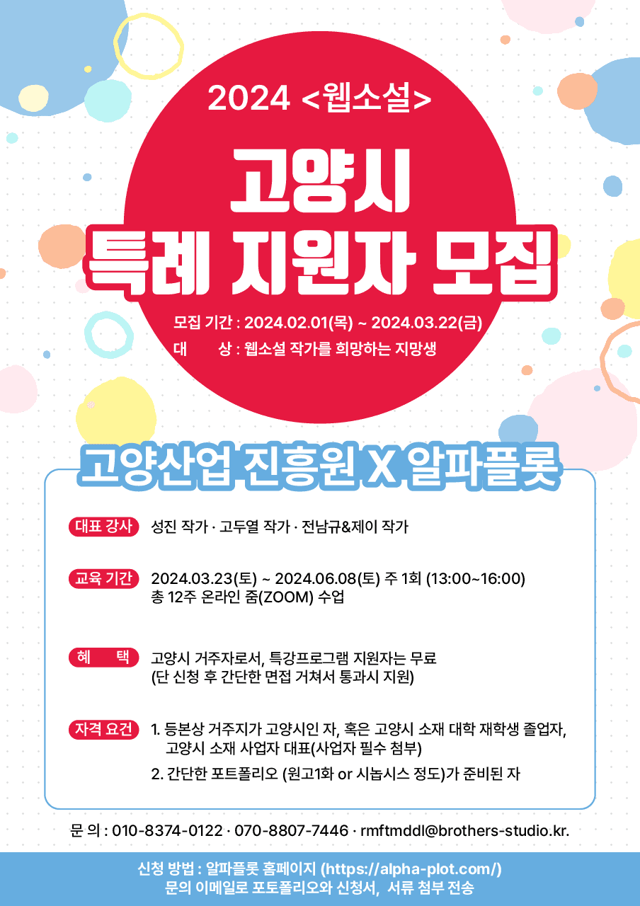 이번 웹소설 프로그램은 알파플롯이 고양산업진흥원과 업무협약(MOU)을 맺으며 고양시 웹소설 인재 양성 및 콘텐츠 사업 육성을 위해 지역사회 연계 및 협력사업 추진, 콘텐츠 교육 프로그램 개발, 홍보, 인프라 지원 등에 상호 협력해 고양시 특례 지원자는 교육비 전액 지원을 받을 수 있다고 전했다.
