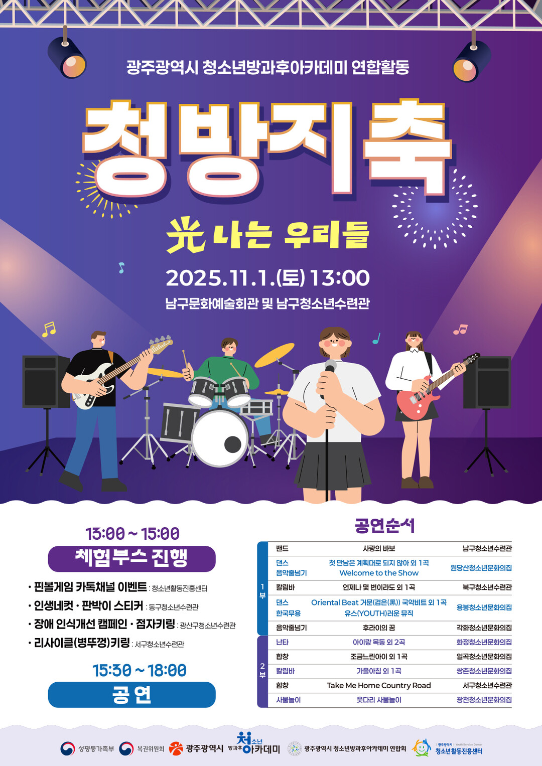 [피앤피뉴스=마성배 기자] 광주광역시청소년방과후아카데미연합회는 광주지역 13개 기관이 참여하는 연합활동 ‘청방지축: 光나는 우리들’을 오는 11월 1일 오후 1시, 광주남구종합문화예술회관 공연장에서 개최한다고 30일 밝혔다.