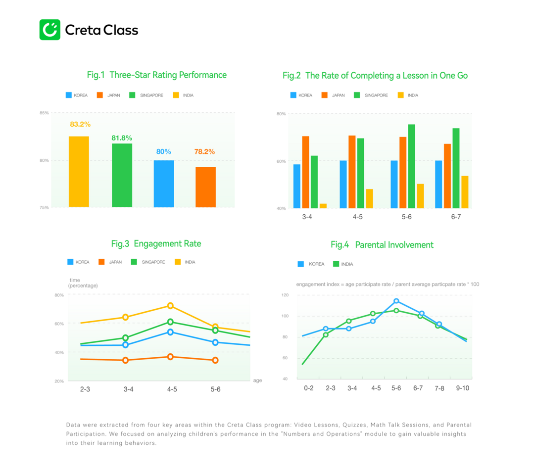 본 연구는 약 5만 명의 글로벌 유저를 대상으로 하였으며, 동영상 콘텐츠, 퀴즈 풀기, 수학 말하기 및 학부모 참여 총 네 가지 부분으로 진행되었다. 3-6세 어린이들이 수학 학습 과정에서 어떻게 행동하는지 관찰하고 나라별로 학습 성과를 분석했다. 그 다음으로 4개국(한국, 인도, 일본, 싱가포르) 어린이들의 수학에 대한 생각과 태도, 그리고 부모가 이 과정에 어떻게 참여하는지 등 흥미로운 인사이트를 제공한다.