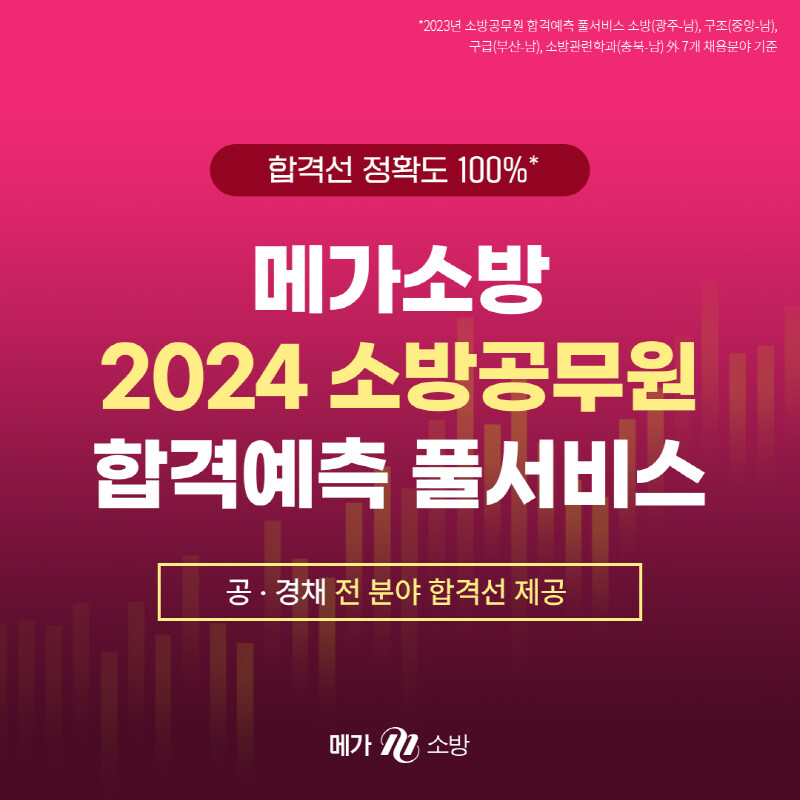 또한 당일 총평 및 해설강의 등 2024 소방공무원 시험에 응시한 수험생을 대상으로 소방시험 관련 다양한 서비스를 제공한다. 시험 당일 저녁 7시부터 메가소방 심승아(소방학/관계법규), 곽동진(소방학/관계법규), 전효진(행정법), 임재희(응급처치학개론) 등 대표 강사들이 나와 과목별 난이도 분석 및 예상 합격컷에 대해 살펴보고, 소방직 최종 합격에 필요한 전략을 공개하는 ‘소방직 총평 라이브’ 방송이 진행될 예정이다.