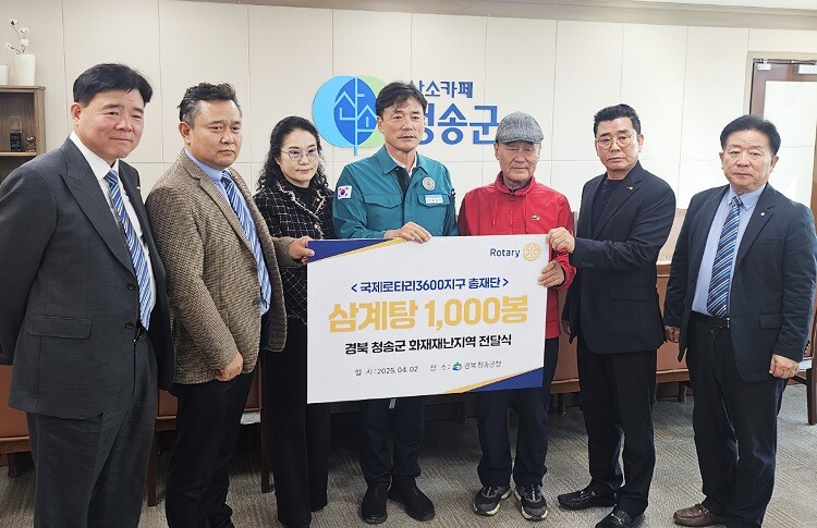 [피앤피뉴스=마성배 기자] ‘국제로타리 3600 지구’ 총재단이 최근 대규모 화재로 큰 피해를 입은 경북 청송군을 찾아 성금 1천만원과 삼계탕 1천마리를 전달하며 피해 복구에 동참했다.