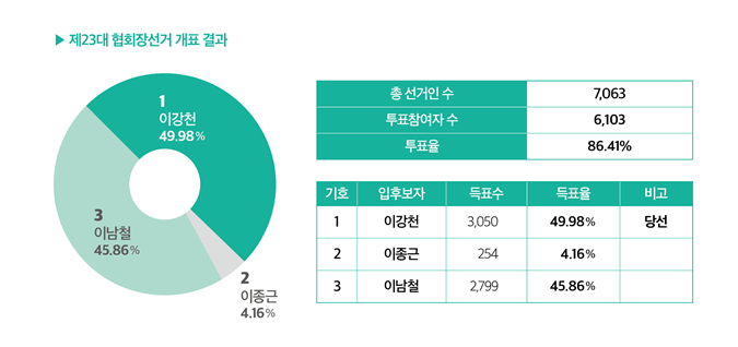 지난 4일 대한법무사협회 선거관리위원회(위원장 박영극)는 법무사회관 연수원 강의실에서 전자투표 시스템으로 치러진 제23대 협회장선거의 개표 결과, 투표참여자 6,103명 중 3,050표(득표율 49.98%)를 획득한 기호 1번 이강천 후보(광주전남회)가 당선자로 확정됐다.