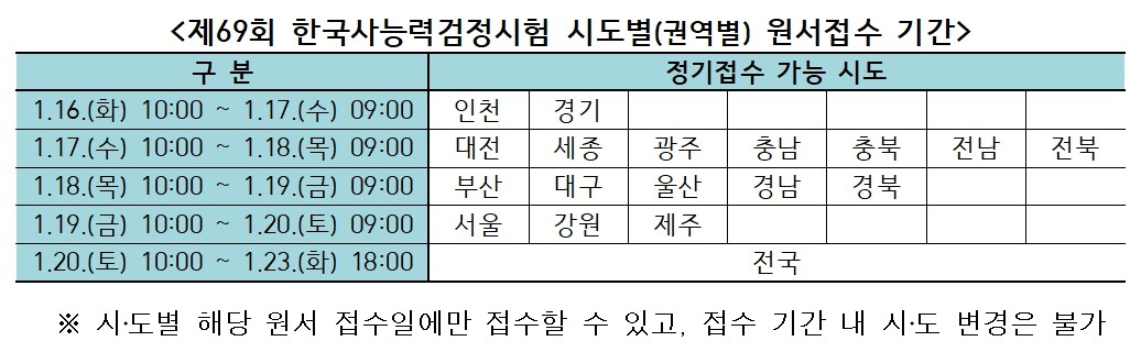 이후 제69회 한국사능력검정시험은 내년 1월 16일부터 원서접수를 시작하고, 2월 17일에 시행된다. 원서접수는 시·도(권역)별로 접수 일자가 다르기 때문에 응시자는 해당 시·도(권역)의 접수 일자를 반드시 확인해서 접수해야 한다. 또한 제69회 한국사능력검정시험 응시요강은 2024년 1월 초 공지 예정할 예정이다.