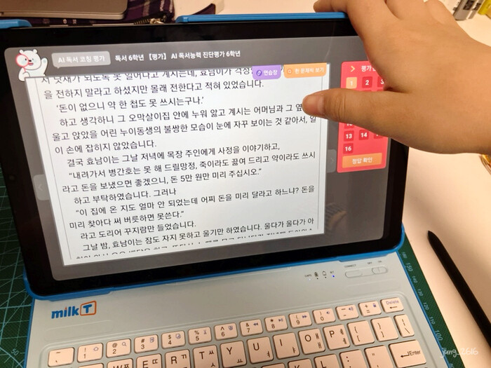 마지막으로 문해력을 위해 필요한 능력인 표현력을 위한 밀크T의 콘텐츠로는 ‘독서논술’이 있다. 독서논술은 독서 전 활동, 독서 활동, 독서 후 활동으로 학습 흐름이 체계적으로 구성되어, 흥미를 고취시키면서 자연스러운 학습 방향을 제시해 준다. 독서 후 활동에서는 책에 대한 이해를 돕기 위한 어휘 학습과 AI 필기 인식을 활용한 쓰기 등을 지원한다.
