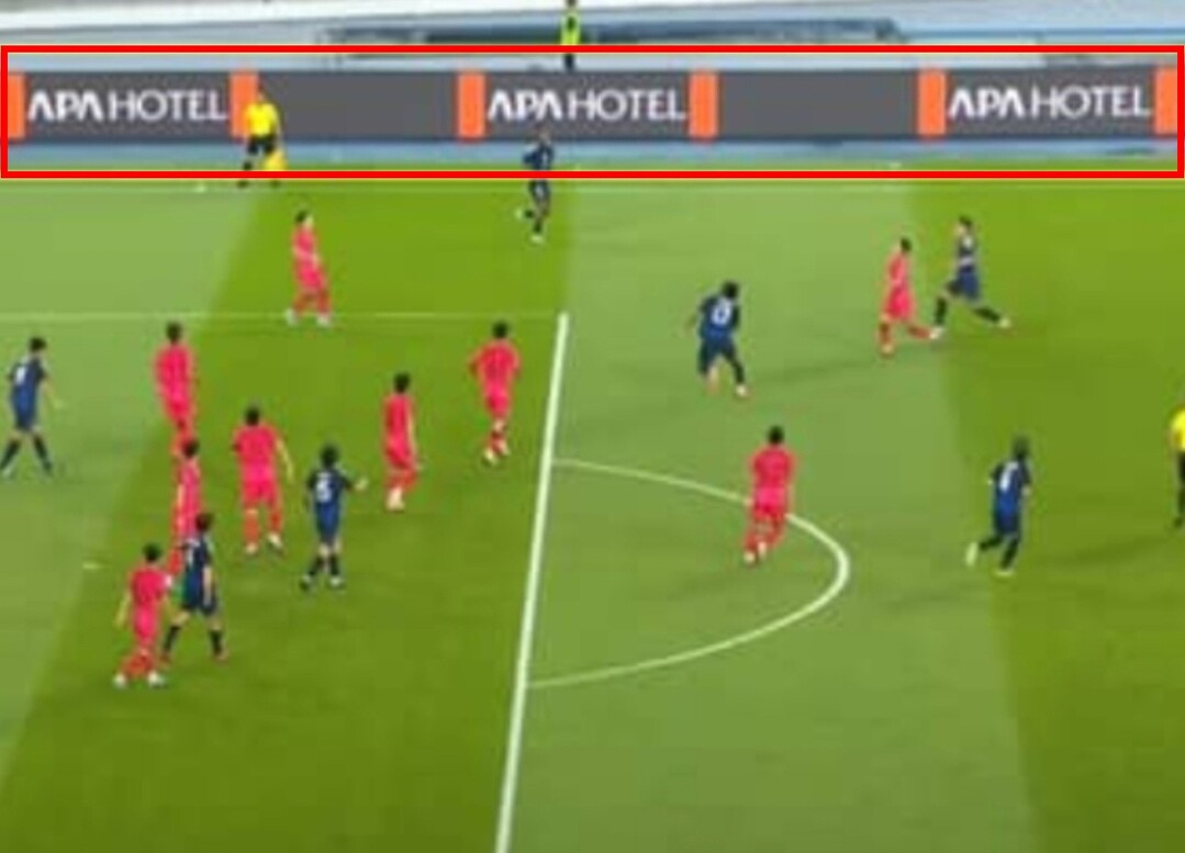 | ▲사진: 한국과 일본 경기에서 등장한 'APA HOTEL' 광고(중계 화면 캡쳐 : 빨간색 부분) |
