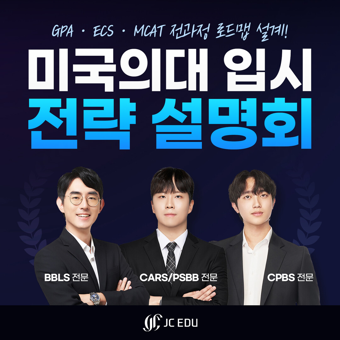 프로그램 역시 ▲미국 의대 Application 완전 해부(이상은 JC EDU 입시전략총괄이사) ▲미국 의대 입시를 위한 Ecs 체크 포인트(신제훈 JC EDU Bluewave 대표) ▲MCAT 마스터 클래스(JAY JC EDU 상담실장) ▲MCAT 고득점 전략1 BBLS(진익섭 JC EDU 대표강사) ▲MCAT 고득점 전략2 CPBS(이승우 JC EDU 전임강사) ▲MCAT 고득점 전략3 CARS/PSBB(정대혁 JC EDU 대표강사), 총 5개로 탄탄하게 진행된다.