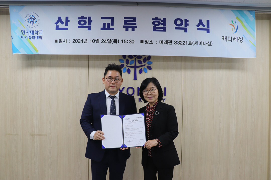 지난 24일 명지대학교 미래융합대학과 캐디세상은 명지대학교 인문캠퍼스 미래관에서 산학협력 상호교류 협약식을 가졌다. 협약식에는 이미숙 명지대 미래융합대학장 및 관련학과 교수들과 캐디세상 김은상 대표, 공동대표 조혜정을 비롯한 협약 관계자들이 참석해 자리를 빛냈다.