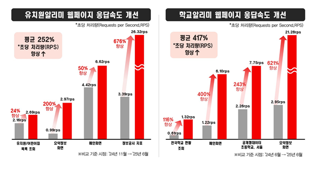 먼저 클라우드 환경으로의 시스템 전환은 올해 2월부터 진행돼 7월에 완료되었다. 이 과정에서 기존 물리 서버 기반 환경에서 발생하던 속도 지연 문제가 개선되면서 서비스 응답 속도가 크게 향상됐다. 초당 처리량(RPS) 기준으로 유치원알리미는 지난해 11월 대비 올해 6월 기준 252% 증가했고, 학교알리미는 지난해 6월 대비 올해 6월 기준 417% 증가하는 등 체감 성능이 확연히 높아진 것으로 나타났다. 이러한 성능 향상은 향후 공시정보를 기반으로 한 인공지능(AI) 분석 및 연계 서비스 확장에도 중요한 기반이 되고 있다.