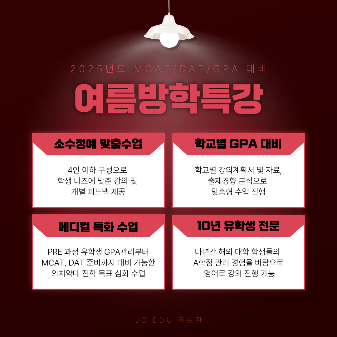 JC EDU 유프관의 여름방학 특강은 ‘2025 여름방학 특강’은 다수의 학생이 수업을 듣는 일반적인 학원 수업과 달리 4명 이하의 소수 수업이 진행될 예정이라 더욱 기대가 크다. 10년 이상 축적된 노하우를 바탕으로 한 CHEMISTRY, BIOLOGY, PHYSICS, MATHEMATICS 계열의 전반적인 과목을 지도하며 맞춤형 ‘하이엔드’ 수업을 목표로 한다.