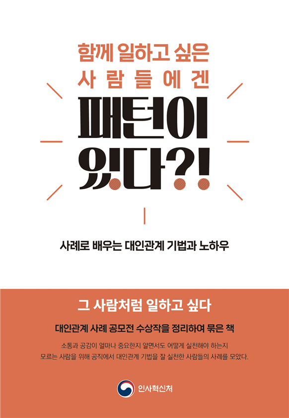 [피앤피뉴스=마성배 기자] 공직 사회에서 대인관계와 협업의 비법을 전수할 ‘실전 교과서’가 나왔다. 인사혁신처(처장 연원정)는 공직 문화 개선을 위한 대인관계 사례집 ‘함께 일하고 싶은 사람들에겐 유형(패턴)이 있다?!’를 발간했다고 24일 밝혔다. 이 책은 공직 생활 속 소통과 갈등 해결의 구체적 사례를 담아 실질적인 지침을 제공한다.