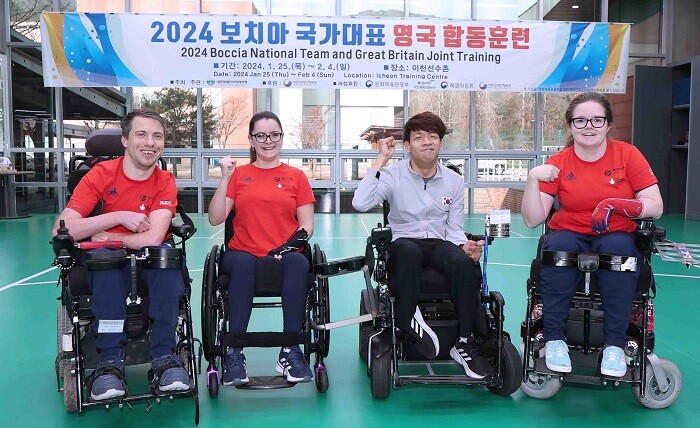 [사진1] 복권기금 지원을 받아 진행한 2024 보치아 국가대표 합동훈련에 참가한 영국 대표님과 및 우리나라 보치아 정호원 선수(우측에서 두 번째) 모습 [사진=대한장애인체육회]