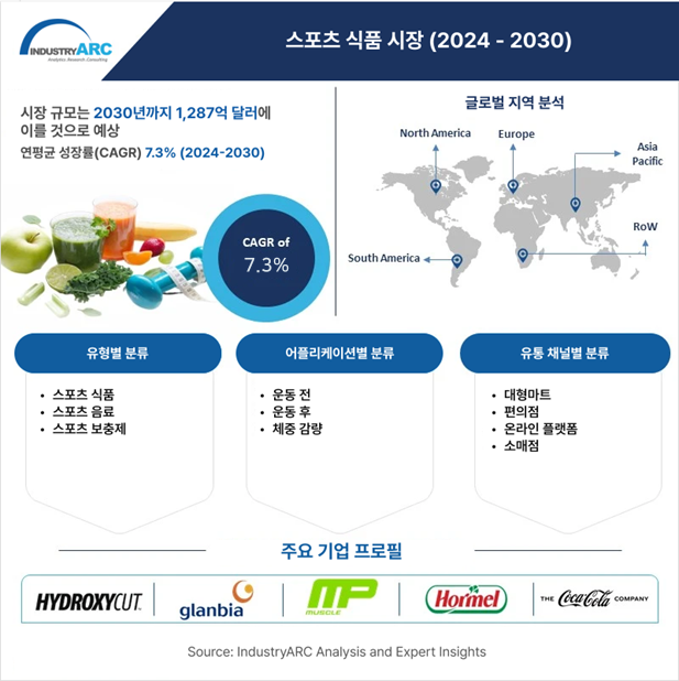 데타에이아이가 최근 ‘스포츠 식품 시장 전망 (2024-2030)’ 보고서를 발간했다. 이 보고서는 스포츠 식품 시장의 현재 동향과 향후 성장 예측을 심도있게 분석하며, 글로벌 시장 진출을 준비하는 기업들에게 중요한 전략적 인사이트를 제공한다. 보고서에 따르면, 글로벌 스포츠 식품 시장은 2024년부터 2030년까지 약 1,287억 달러에 도달하며, 연평균 성장률(CAGR) 7.3%를 기록할 것으로 예상된다.