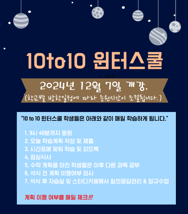 한편 본원에서는 겨울방학 예비고2~고3 과탐 8주특강 1월 6일 개강하여 할 예정이며, 내신/수능대비 평일 주말 10 to 10 집중반은 오전 9시 40분부터 오후 10시까지 메타인지를 활용한 자기주도학습과 대치, 압구정에서 건너온 최고의 강사진과 함께 공부할 수 있도록 수업 일정을 만들어 두었으며, 교육 개강에 따른 예약 접수를 받고 있으며 전화 또는 홈페이지를 통해 상담을 진행할 수 있다.