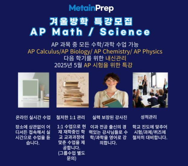 메타인프렙 관계자는 "학생들이 체계적인 준비를 통해 내신 성적과 AP·미국 수학 시험에서 뛰어난 결과를 얻기를 기대한다"고 강조했다.