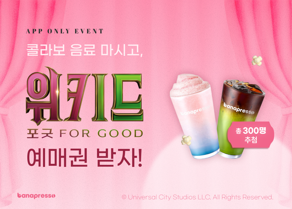 카페 브랜드 바나프레소(Banapresso) 가 영화 <위키드: 포 굿(Wicked: For Good)>과의 콜라보레이션을 기념해 총 300장의 영화 예매권을 증정하는 앱 전용 이벤트를 진행한다.