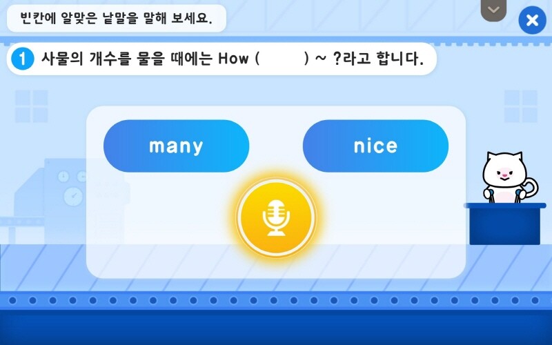 다음으로는 사물의 개수를 묻는 표현을 익히기 위해 'How Many Apples?'라는 문장을 오감을 통해 학습하도록 유도하는 것을 살펴볼 수 있다. 가령 'many'와 'nice' 중 빈칸에 들어갈 알맞은 낱말을 소리 내어 읽어보고, 손으로 써보는 퀴즈를 수행하게 되는데 반복되는 학습을 통해 상황에 따른 영어 표현을 마스터할 수 있는 것이다.