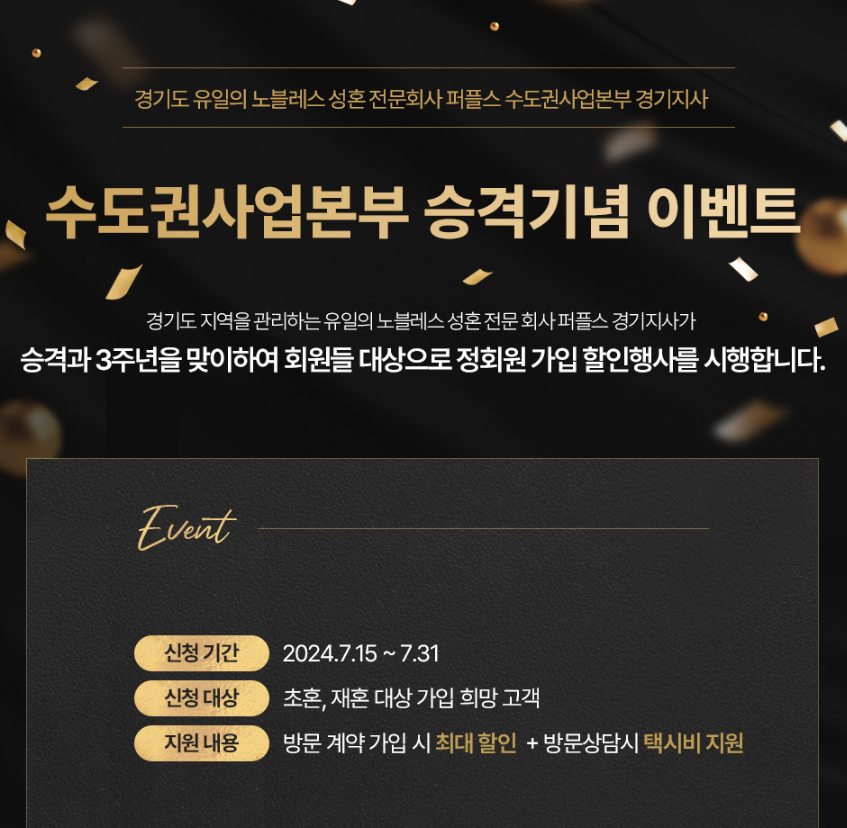 특별 가입 할인 이벤트의 내용으로는 방문 계약 가입 시 가입비 최대 할인과 더불어 방문 상담 시 택시비 지원이 포함되어 있으며, 초혼 및 재혼 대상 가입 희망 고객을 대상으로 7월 31일까지 진행될 예정이다.