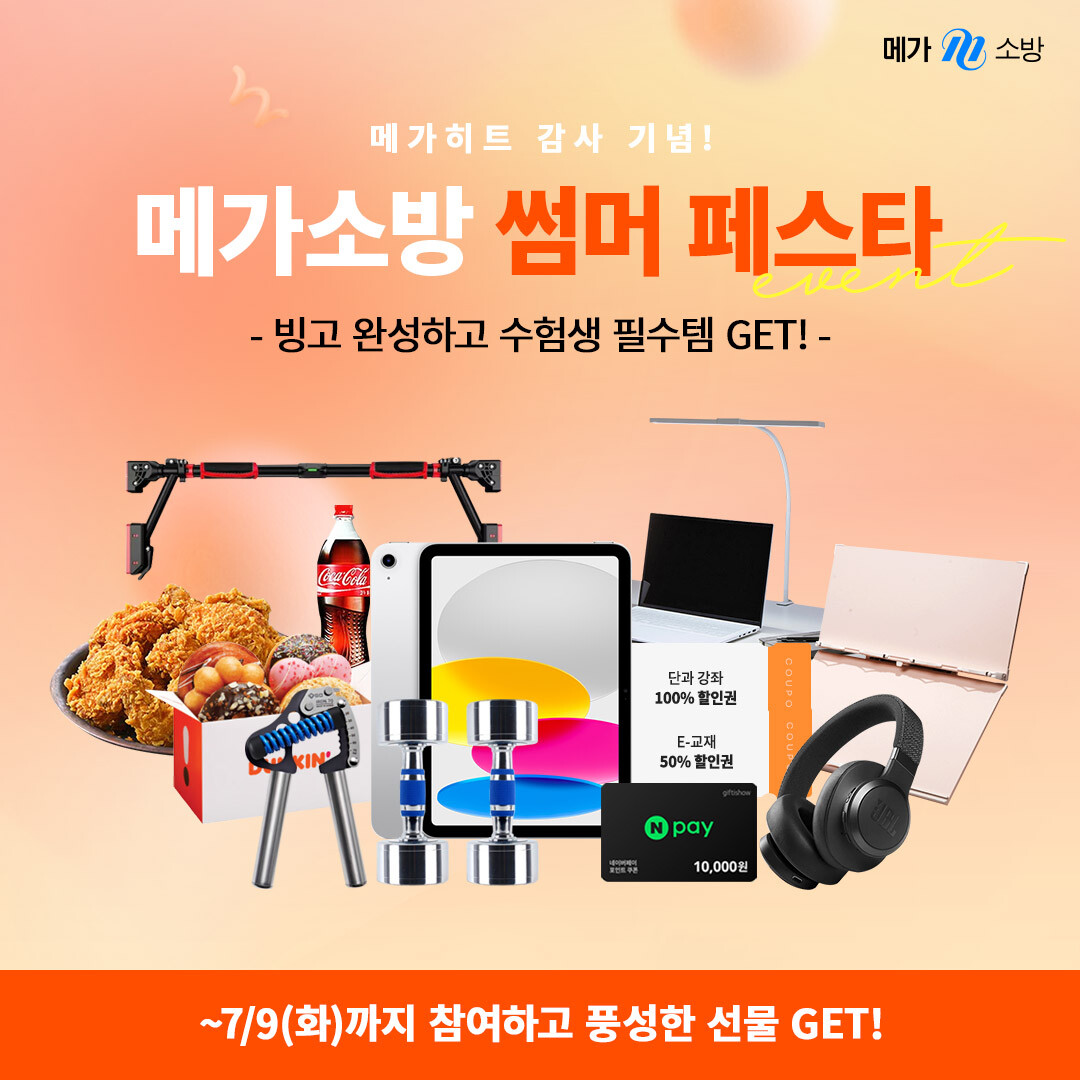 [피앤피뉴스=마성배 기자] 메가스터디교육이 운영하는 소방공무원 시험 전문 브랜드 ‘메가소방’이 수험생과 함께 이룬 메가 히트 기록에 대한 감사의 일환으로 ‘메가히트 감사제 – 메가소방 썸머 페스타’를 진행한다.