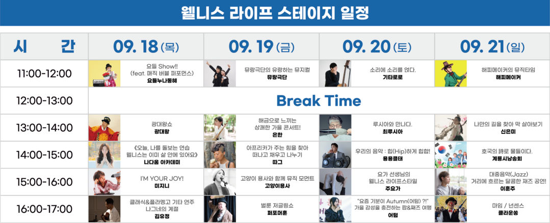 9월 18일(목)은 ▲요들송 & 매직 버블 퍼포먼스, 광대왕 쇼 등 유쾌한 공연 ▲웰니스 강연 ‘오늘, 나를 돌보는 연습’ ▲ 감성 라이브 공연과 클래식·플라멩코 기타 연주 등 콘텐츠를 경험할 수 있다.