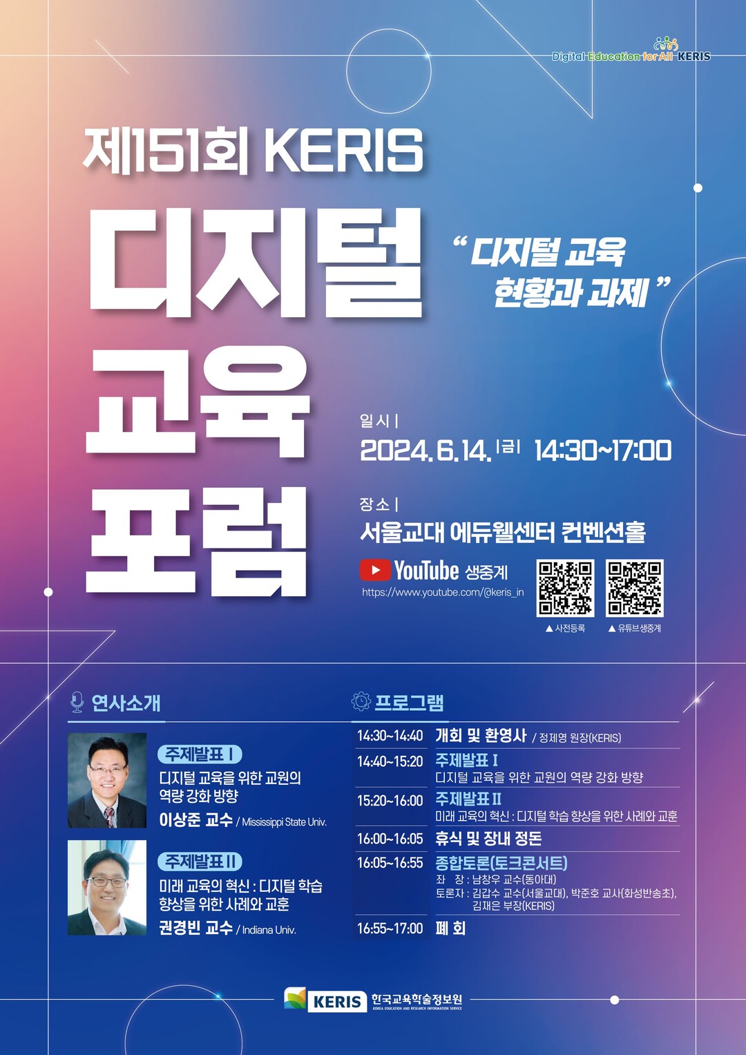 [피앤피뉴스=마성배 기자] 한국교육학술정보원(KERIS, 원장 정제영)은 오는 14일 서울교대 컨벤션홀에서 “디지털교육 현황과 과제”를 주제로 제151회 디지털교육포럼을 개최한다고 밝혔다.