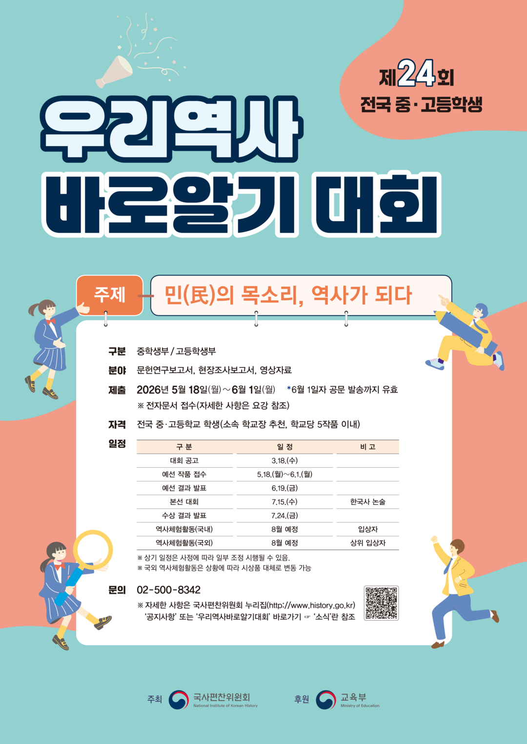 국사편찬위원회는 30일 ‘2026년 제24회 전국 중·고등학생 우리역사바로알기대회’를 개최한다고 밝혔다.
