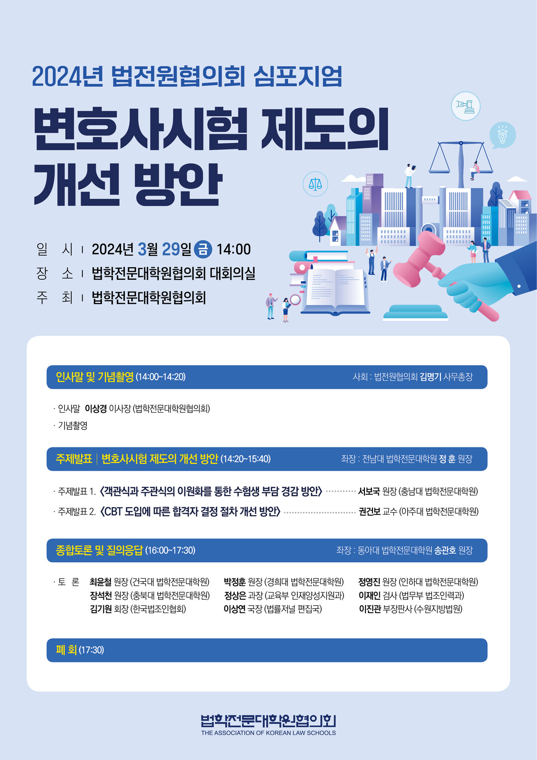 [피앤피뉴스=마성배 기자] 법학전문대학원협의회(이사장 이상경)는 3월 29일 서울 중부등기소 5층 협의회 대회의실에서 ‘변호사시험 제도의 개선 방안’을 주제로 법학전문대학원협의회 심포지엄을 개최한다고 28일 밝혔다.