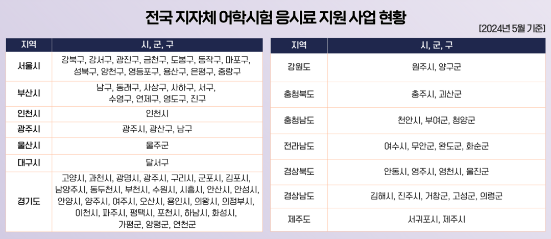 대표적인 어학·자격시험 응시료 지원 사업으로는 ▲서울시 ‘청년수당’, ▲경기도 ‘경기청년 역량강화 지원사업’, ▲인천광역시 ‘청년 자격증 응시료 지원’, ▲광주광역시 '2024 구직청년 자격증 취득지원' 등이 있다.