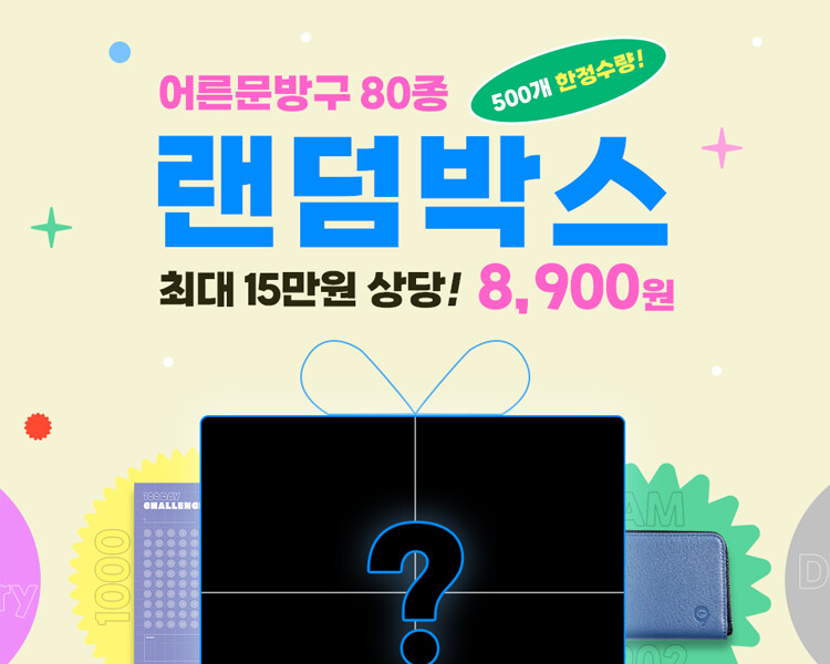 8900 랜덤박스 이벤트는 어른문방구의 문구상품, 플래너, 트래커, 2024년 달력 등 80여종의 상품 중 9종을 최대 90% 할인된 8,900원의 저렴한 가격에 랜덤발송 해주는 이벤트이다. 해당 이벤트는 12월 22일까지 진행되며, 500개 상품 한정으로 물량소진 시 조기종료 될 예정이다.