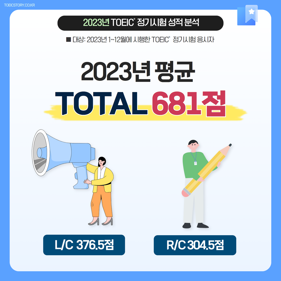 한국TOEIC위원회가 공개한 자료에 따르면, 2023년 토익 정기시험의 응시자 평균 점수는 681점(듣기: 376.5점, 읽기: 304.5점)으로 나타났고, 전년도(2022년) 정기시험 평균 점수인 679점보다 소폭 상승한 것이다.
