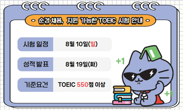 한국TOEIC위원회는 “공직 채용시험과 관련해 공인 영어성적 제출 시한을 놓쳐 지원 자체가 불가능한 사례가 매년 반복되고 있다”며 “이번 경찰 채용에 응시하려면 8월 10일 시험이 실질적으로 마지막 기회인 만큼 철저한 일정 확인이 필요하다”고 당부했다.