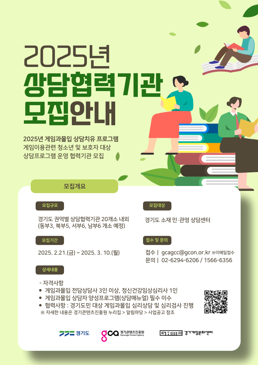 상담 협력기관 모집과 관련한 자세한 내용은 경기콘텐츠진흥원 누리집 사업공고란에서 확인할 수 있다.