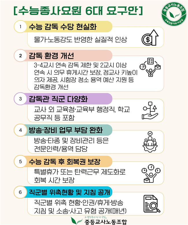 중등교사노조는 이번 설문을 바탕으로 △수당 현실화 △감독 환경 개선 △감독관 직군 다양화 △방송·장비 외부 위탁 △회복권 보장 △위촉 현황 및 지침 공개 등 ‘6대 요구안’을 발표했다.