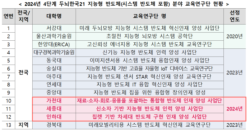 이번 선정으로 4단계 두뇌한국21 혁신인재 양성사업의 지능형 반도체(시스템 반도체 포함) 분야 교육연구단은 기존의 10개에서 총 13개로 늘어나게 된다. 해당 사업은 2027년까지 매해 13개 교육연구단에 총 100억여 원을 지원할 계획이다.