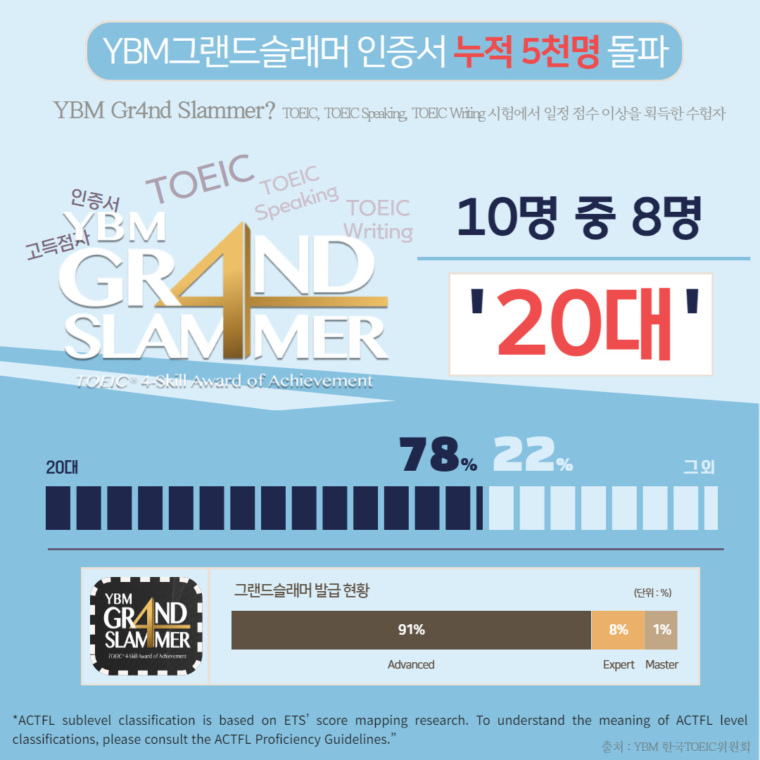 최근 2년 이내 YBM그랜드슬래머 인증서 발급 현황 자료에 따르면, ▲Advanced 등급(91%), ▲Expert 등급(8%), ▲Master 등급(1%) 순으로 나타났다.