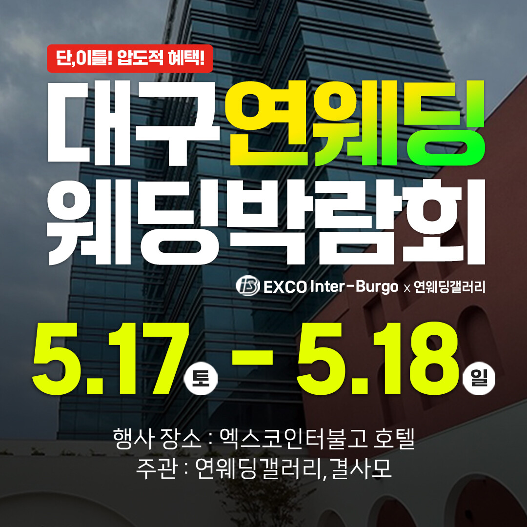 대구웨딩박람회가 오는 5월 17일~18일까지 북구 유통단지 내에 엑스코인터불고호텔 1층에에서 개최된다. 연웨딩과 함께하는 대구 연웨딩박람회 일정 중 가장 규모 있는 결혼준비 행사이다.