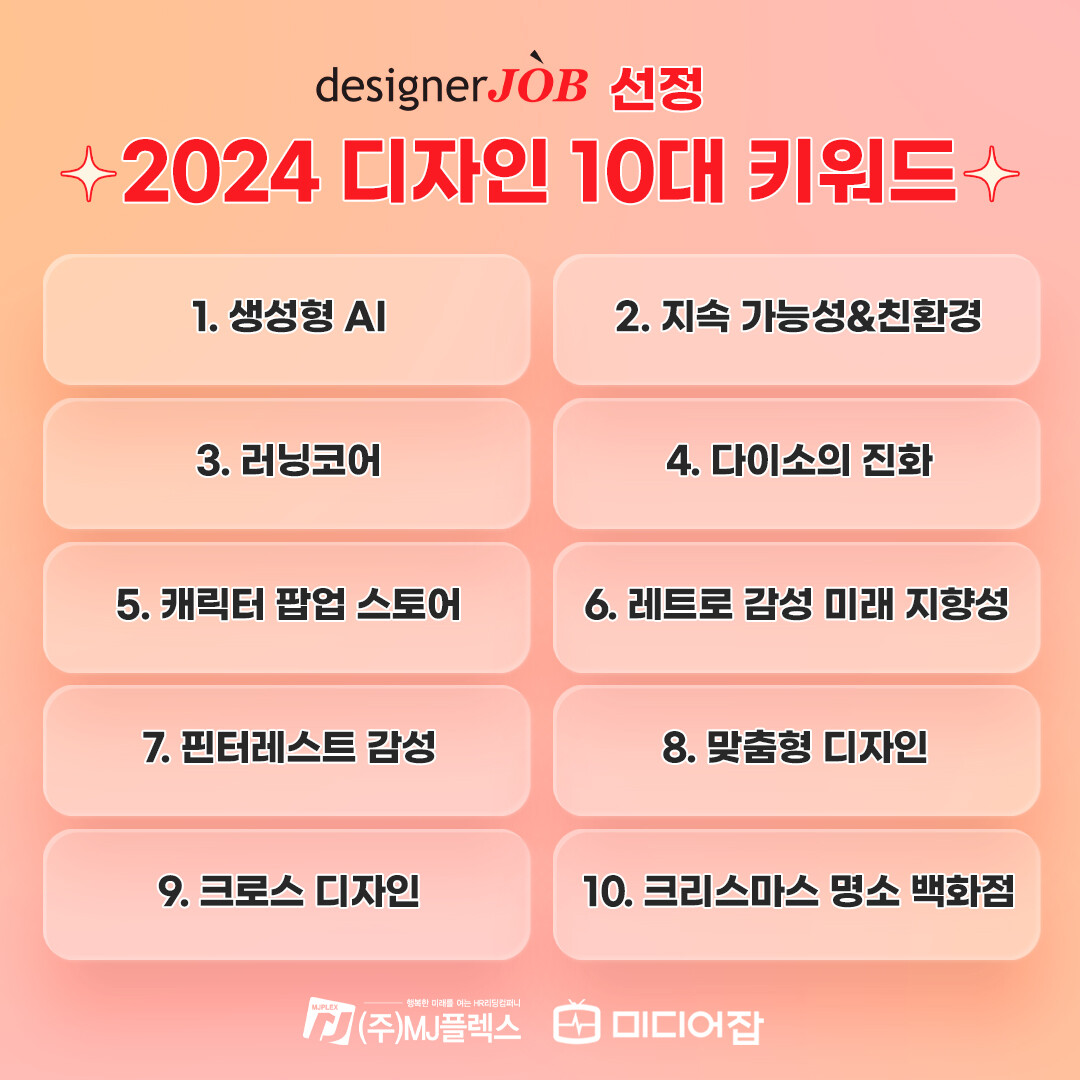 디자인 전문 플랫폼 디자이너잡과 미디어잡을 운영하는 MJ플렉스가 2024년 디자인 업계의 주요 트렌드 10가지를 선정해 발표하며, 빠르게 변화하는 업계의 흐름을 짚었다.