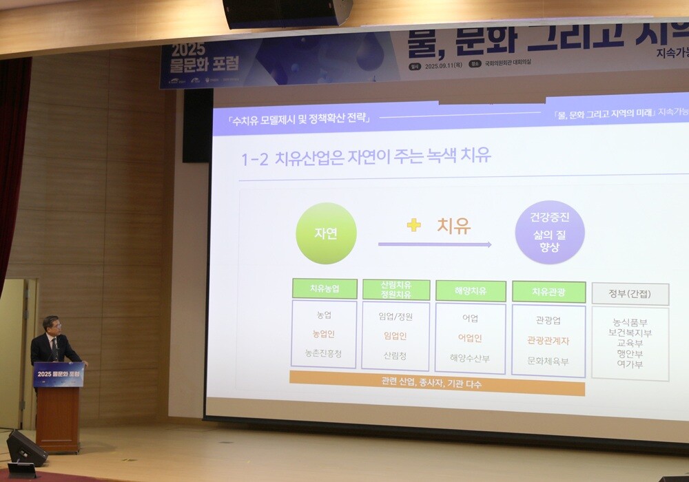 물의 문화적 가치와 지역의 지속가능성을 논의하는 ‘2025 물문화 포럼’이 11일 국회의원회관 대회의실에서 개최된 가운데, 신한대학교 치유산업학과 박민근 교수가 주제 발표자로 나서 ‘수치유(물치유) 모델제시 및 정책확산 전략을 발표하면서 수치유산업 시작을 알렸다.