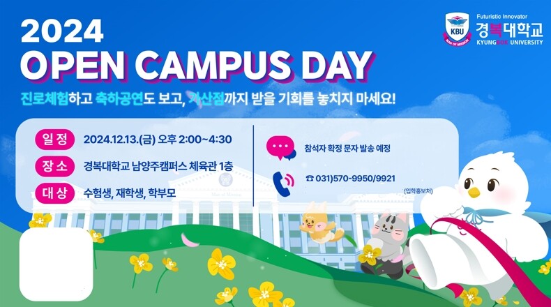 [피앤피뉴스=이수진 기자] 경복대학교가 12월 13일 금요일 오후 2시부터 4시 30분까지 남양주 캠퍼스 문화관 1층 체육관에서 ‘경복 오픈캠퍼스데이’(이하 오픈캠퍼스데이)를 개최한다고 밝혔다.